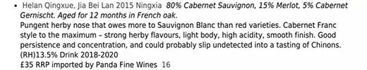 ▲Jancis Robinson的酒评,考虑到她现在评分非常保守,给加贝兰2015所打的16分已颇为不俗。