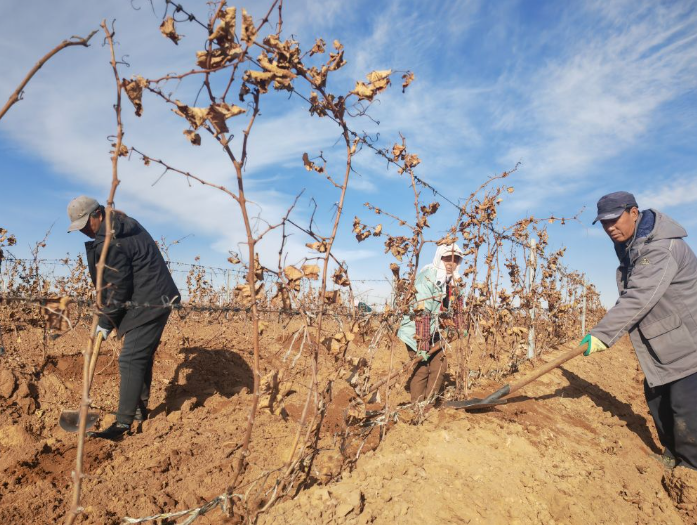 葡萄园里,农机还在轰鸣作业,武治兵挥舞铁锹,一铲、一拍、一压,加快了手头工作。“等明年三月,我们再来出土展藤,紧接着又是绑蔓、抹芽、除草等等,一年有9个多月都在地里干活,习惯了。”他笑着说,这一年的活计、生计基本都在葡萄园。据统计,宁夏葡萄酒产业每年为周边群众提供就业岗位13万个。