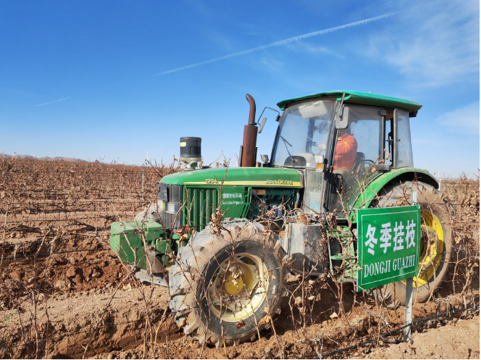 宁夏青铜峡葡萄酒产业发展服务中心技术室主任李庄严介绍,传统越冬要将结果藤剪碎清理完全,再将营养藤小心翼翼压弯埋土,费时耗力、用工紧张、成本大,而“挂枝越冬”这一技术革新可节约30%的人力成本,同时有利于形成天然的防风固沙屏障,有效抵御冬季恶劣天气对葡萄园的影响。