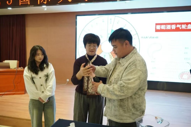 在风土课堂环节,北方民族大学张红梅教授为银川科技学院的同学们带来了一场别开生面的大师课。课程深入浅出地解读了产区的风土密码,并通过系统品鉴引导年轻学子建立起对葡萄酒的初步认知,现场互动热烈,求知氛围浓厚。