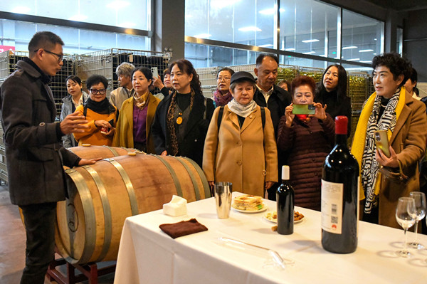 活动中,老年学员们跟随讲解员走进葡萄园、酿酒车间与地下酒窖,深刻理解了贺兰山东麓如何从一片荒滩蜕变为世界公认的“葡萄酒黄金产区”。在酒窖橡木桶陈列区,学员们轻敲桶壁聆听陈酿的回响,亲手触摸记录着年份的桶标。