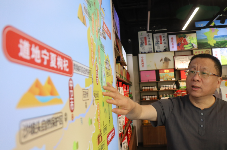 货架间挂着一幅宁夏文化旅游景点分布图,泉州市芸荟投资发展有限公司总经理曾伟明看着地图说:“宁夏从南到北,我都走遍了。几天前,我刚从宁夏回来,这是我第24次去宁夏。”