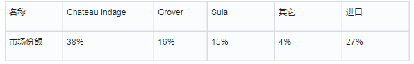 印度主要有三大葡萄酒生产商,分别是Chateau Indage Ltd.(CIL)、Grover Vineyards以及Sula酒业。2005至2006年,印度葡萄酒市场份额情况如下: