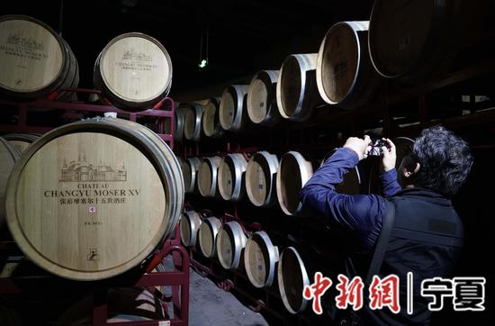 图为中新社记者在酒庄参观采访。崔楠 摄
