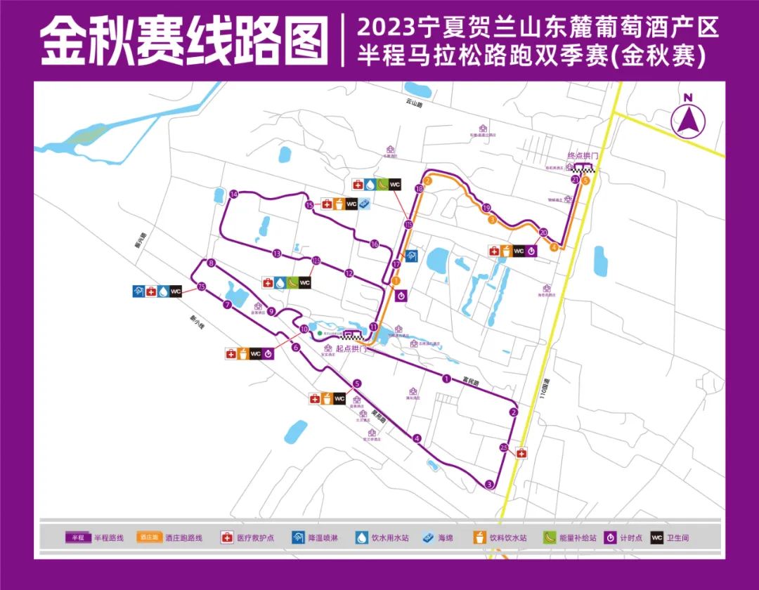 “醉美”酒庄跑由贺兰山运动公园东门出发——左转进入源石酒庄内部路向北——右转进入源石酒庄内部路向东——110国道并行线左转向北,至终点银川贺兰山东麓旅游度假区综合服务中心。同时,自起点开始每5公里设置一个饮料站,两个饮料站之间设置饮水/用水站。